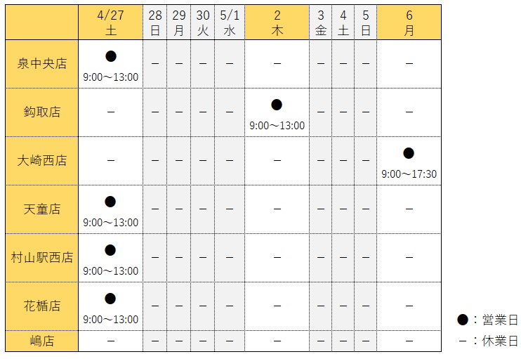 誠に勝手ながらゴールデンウィーク期間中は、以下の日程での営業とさせていただきます。