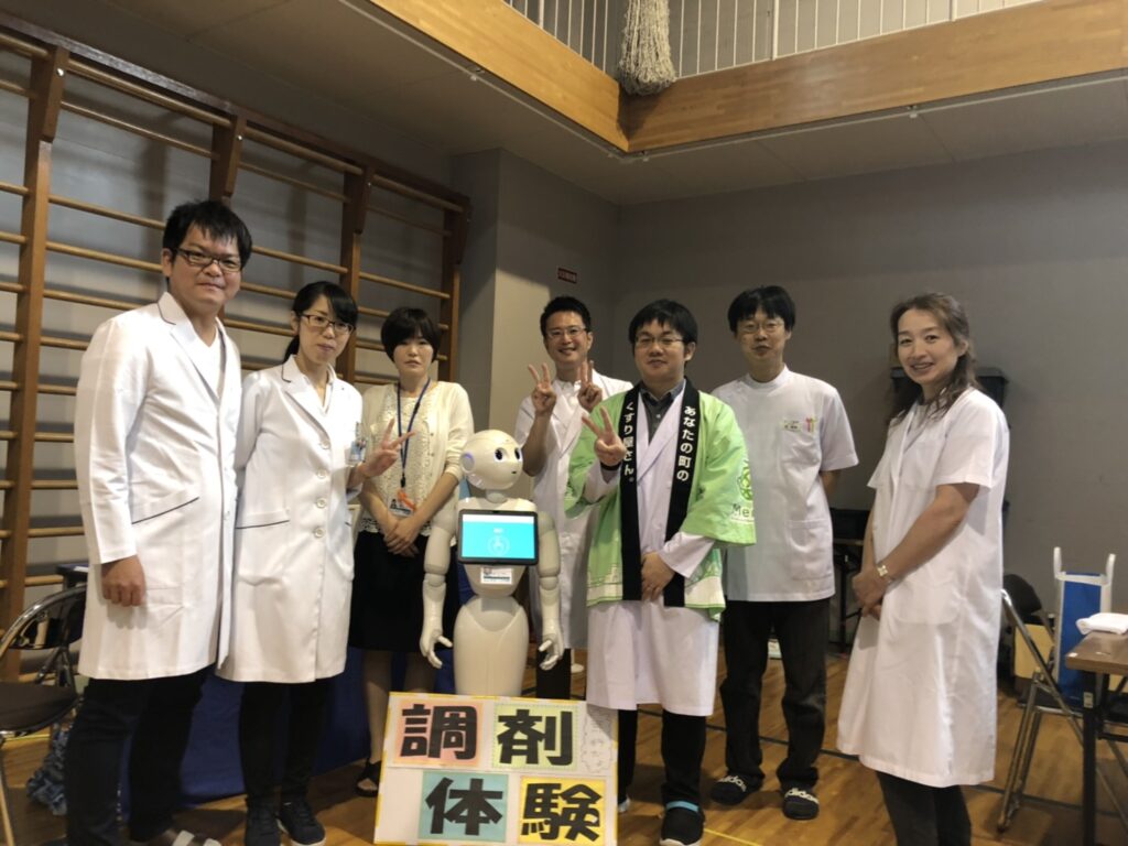 子供調剤体験では、子供たちは最初に「調剤薬局の薬剤師の仕事」について簡単に学び、ペッパー君からのクイズに答えます。